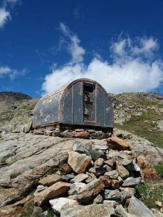 La descente du côté italien se passe dans un environnement très rocailleux et les indications où passer ne sont pas toujours faciles à trouver, on a un peu improvisé entre les rochers avec de bonnes parties de rire avec Antonin ! on a ensuite trouvé un arrière de gros bloc pour manger un brin et faire une (petite) pause puis nous sommes reparti, une espèce de tempête orageuse (froide) arrivait derrière nous et nous n’avons pas tardé. Ensuite pause bienvenue au refuge Nacamulli, les doigts et les pieds commençaient à être bien gelés, on en a profité pour se réchauffer et boire un thé, puis changer de chaussettes car elles étaient mouillées chez nous deux et ce n’est pas bon pour la descente, expérience faite !