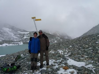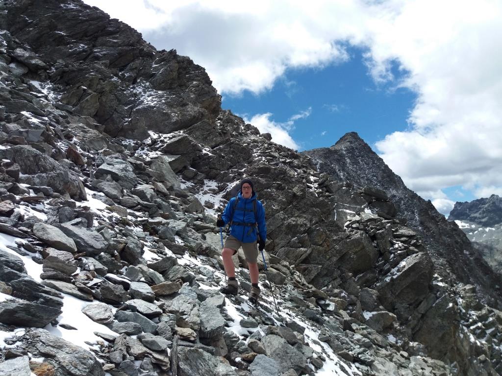 La météo était annoncée fraîche, nuageuse, venteuse et humide, plus on montait et plus on se disait que l’équipement adéquat était nécessaire. Trois ans avant je passais le col en t-shirt et grand ciel bleu ; là c’était gants, bonnets et veste d’hiver ! Donc passage du Haut Glacier, montée au col Collon (3'087 m), arrivée vers midi par -5°C, il grésillait et après avoir remercié notre guide, nous n’avons pas tardé pour descendre un peu en altitude.